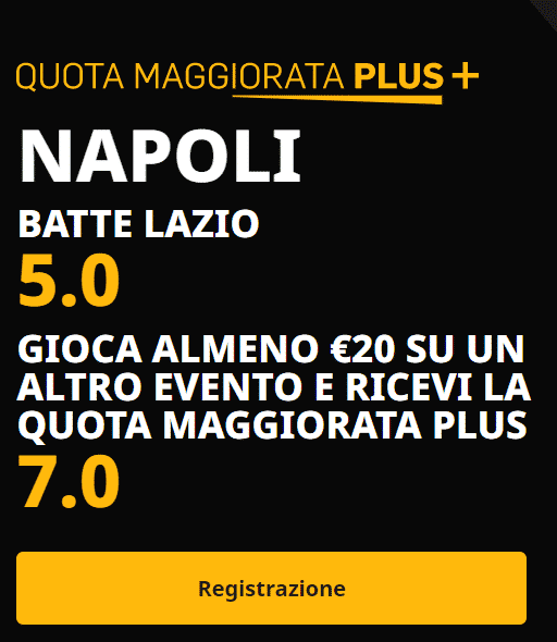 La quota maggiorata plus offre ai nuovi utenti la vittoria del Napoli sulla Lazio a quota 7.00! Per ottenerla il procedimento è uguale al precedente, con un’aggiunta: